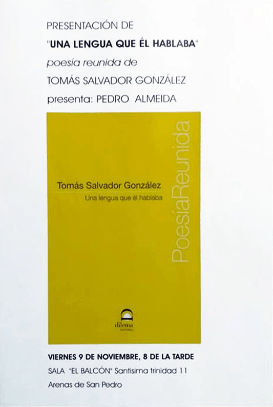 - 9 de noviembre de 2018. PEDRO ALMEIDA: PRESENTACIÓN LIBRO DE TOMÁS SALVADOR «Una lengua que él hablaba». Sala el Balcón, Arenas de san Pedro.