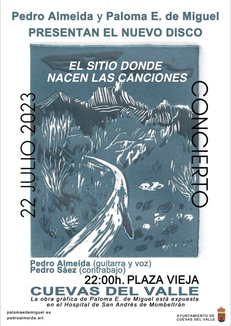 - 22 de julio. 22:00 h. Plaza Vieja de Cuevas del Valle (Ávila) PEDRO ALMEIDA con Pedro Sáez (contrabajo). Presentación del disco El sitio donde nacen las canciones y el libro de artista con grabados de Paloma E. de Miguel.
