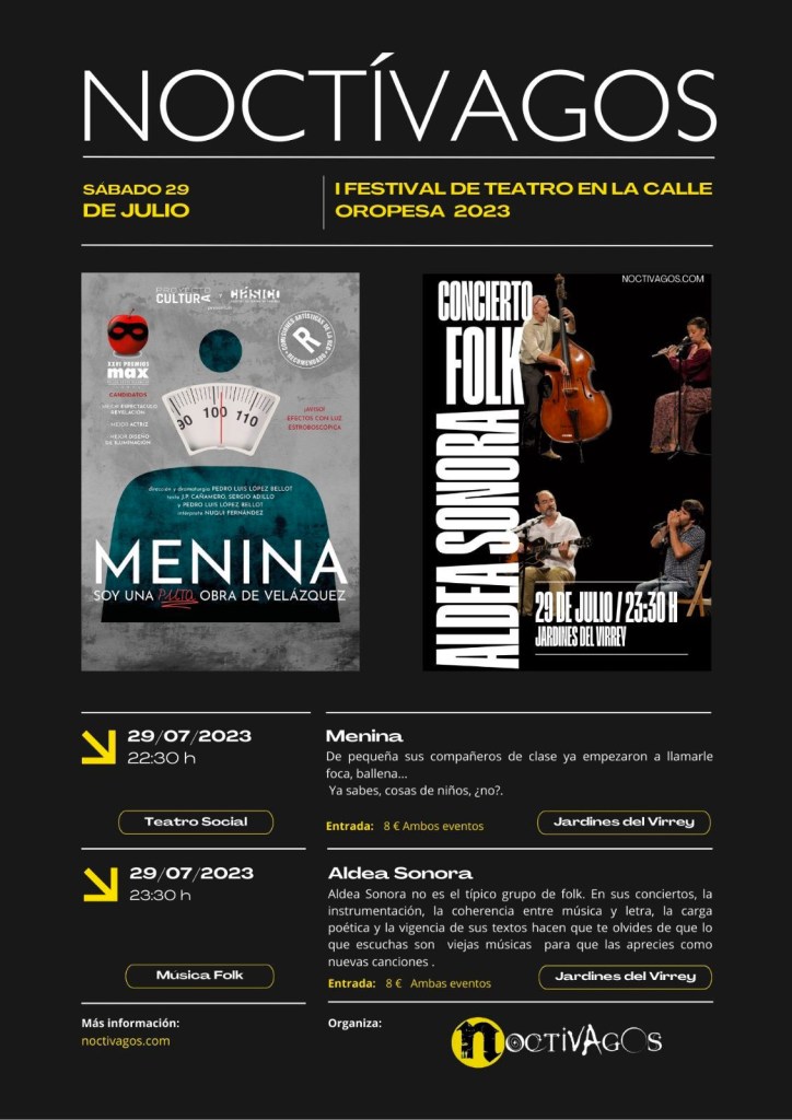- 29 de julio:23:30 h. Jardines del Virrey. Oropesa (Toledo). ALDEA SONORA. I FESTIVAL DE TEATRO EN LA CALLE «NOCTÍVAGOS».