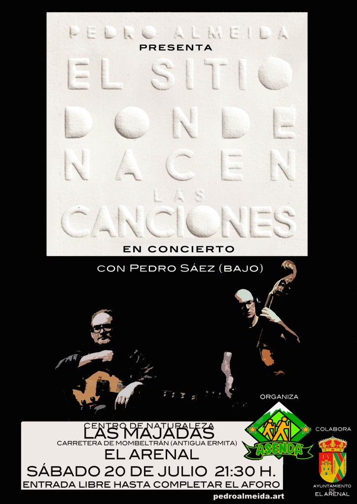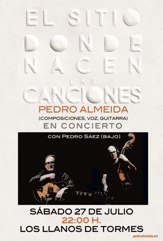 - 26 de julio. 22:00 h. Terraza del Hostal Almanzor. Navarredonda de Gredos (Ávila) PEDRO ALMEIDA con Pedro Sáez (contrabajo). Presentación del disco El sitio donde nacen las canciones.